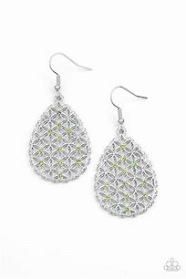 Dainty green rhinestones are encrusted across the front of a silver teardrop frame filled with ornate tactile filigree, creating a whimsical lure. Earring attaches to a standard fishhook fitting