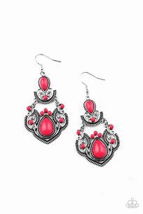 Dotted with round and teardrop pink beads, a stacked silver frame radiating with studded and linear detail swings from the ear for a colorfully regal look. Earring attaches to standard fishhook fitting.