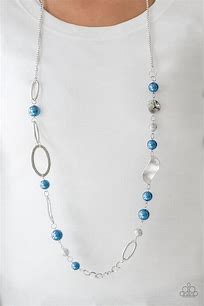 Oversized blue pearls, ornate silver beads, and an array of glistening silver accents trickle along a lengthened silver chain for a refined look. Features an adjustable clasp closure.