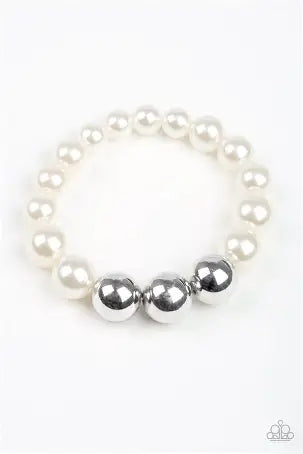 Gradually increasing in size near the center, oversized pearly white and shiny silver beads are threaded along a stretchy band around the wrist for a glamorous finish.