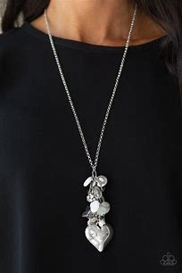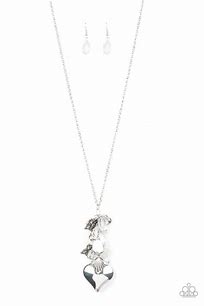 Infused with an array of white beads, a collection of antiqued silver shell and butterfly charms trickle along the bottom of a shimmery silver chain. Complemented with glittery white rhinestone encrusted beads, a dramatically oversized silver heart pendant swings from the bottom of the clustered tassel for a whimsical finish. Features an adjustable clasp closure.