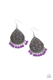 Dotted with a dainty red bead, a silver flower is surrounded by an antiqued silver filigree teardrop frame. A row of purple beads at the bottom of the teardrop adds color and fun for a playful look. Earring attaches to a standard fishhook fitting.