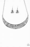 Swirling with ornate filigree filled detail, a shimmery silver crescent plate swings below the collar for a fierce look. Features an adjustable clasp closure.