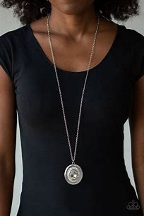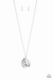 Encircled in rings of glassy white rhinestones, an oversized white gem is pressed into the center of a glistening silver frame, creating a glamorous pendant at the bottom of a lengthened silver chain. Features an adjustable clasp closure.