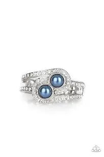 Glittery white rhinestone encrusted bands swirl around a pair of dainty blue pearls for a refined look. Features a dainty stretchy band for a flexible fit.