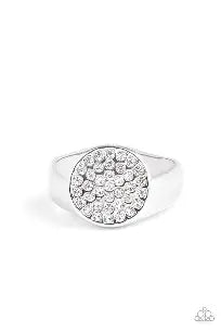 Glassy white rhinestones are encrusted atop a flattened circular frame for a statement look. Features a stretchy band for a flexible fit.