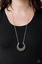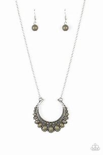 Gradually increasing in size towards the center, dainty Martini Olive beads are encrusted along the center of a silver crescent frame. Martini Olive beads flare out from the bottom of the shimmery silver frame, creating a bold stationary pendant at the bottom of an elongated silver chain. Features an adjustable clasp closure.