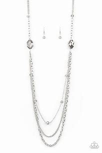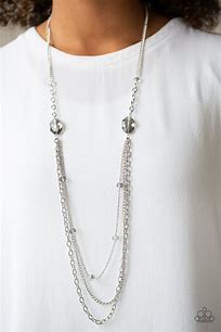 Infused with metallic crystal-like beads, a pair of glittery metallic gems gives way to layers of mismatched silver chains for a dazzling look. Features an adjustable clasp closure.