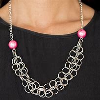 Two oversized pink pearls give way to dramatic silver chains, creating bold layers below the collar for a sassy look. Features an adjustable clasp closure. Sold as one individual necklace.