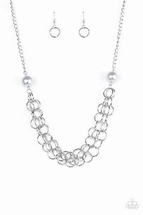 Two oversized silver pearls give way to dramatic silver chains, creating bold layers below the collar for a sassy look. Features an adjustable clasp closure.