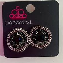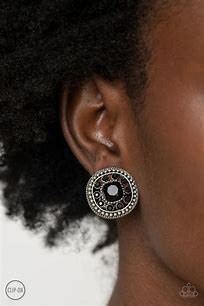 Featuring an oversized center, a black rhinestone encrusted flower blooms across the silver center of a studded frame for a sparkly finish. Earring attaches to a standard clip-on fitting.