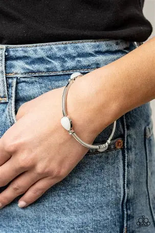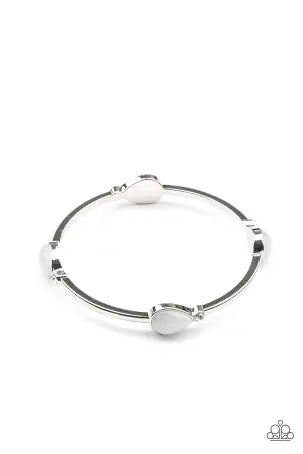 Pairs of glassy white teardrops and dainty white rhinestones embellish a classic silver bangle, creating a dreamy display around the wrist.
