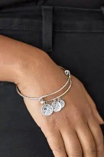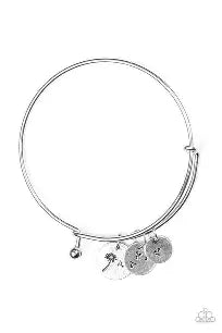 Stamped in dandelion patterns, glistening silver charms featuring floral patterns slide along a sleek bar fitting for a whimsical look. Features a toggle closure.