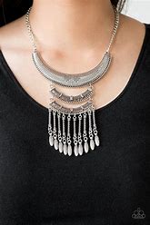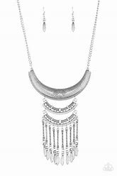 Stamped and embossed in tribal inspired patterns, three silver plates connect down the chest, creating a fiercely stacked pendant. Attached to twisted silver rods, ornate silver beads swing from the bottom of the lowermost plate, creating an eye-catching fringe. Features an adjustable clasp closure.