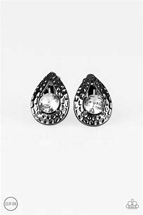 An oversized white rhinestone is nestled inside a hammered silver teardrop, creating a regal frame. Earring attaches to a standard clip-on fitting.