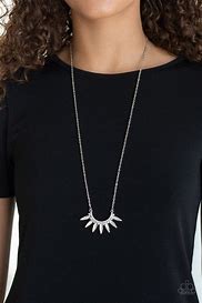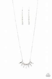 White rhinestone gems flare out from the bottom of a bowing silver frame encrusted in glittery rhinestones. The ornate pendant swings from the bottom of a mid-length silver chain for an edgy-glamorous look. Features an adjustable clasp closure.