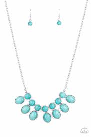 Round turquoise stone beads connect to oval turquoise stone beads, creating an earthy fringe below the collar for a seasonal look. Features an adjustable clasp closure.