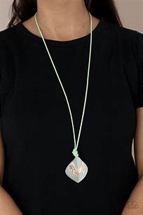 Varying in size, flared silver frames and a hammered shiny copper plate are knotted in place at the bottom of a green cord for an artisan inspired display. Features an adjustable clasp closure.