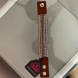 Glassy white and smoky rhinestones are encrusted along strands of brown suede. Glistening silver and gold chains are added to the bands, adding edgy industrial shimmer to the sassy palette. Features an adjustable snap closure.