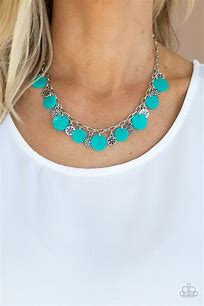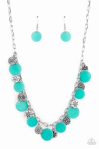 A whimsical collection of mismatched silver floral charms and refreshing blue acrylic discs swing from a silver chain, creating a vivacious fringe below the collar. Features an adjustable clasp closure.