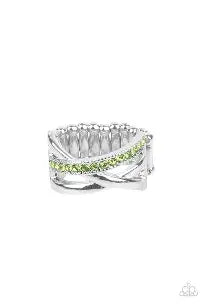 Bands of crisscrossing shining silver bars are highlighted by a row of glittering Peridot rhinestones for a ritzy finish across the finger. Features a stretchy band for a flexible fit.