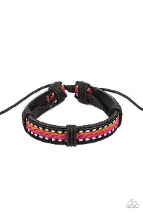 Featuring orange, pink, and white thread, a decorative textile is knotted in place across the front of a dainty brown leather band for an adventurous look. Features an adjustable sliding knot closure.