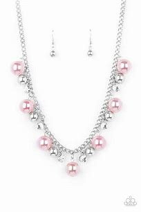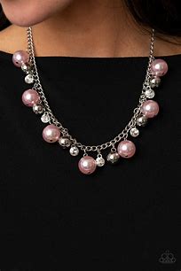 An oversized collection of shiny silver beads, white rhinestone accents, and iridescent pink pearls dangle from a classic silver chain, creating a stellar fringe below the collar. Features an adjustable clasp closure.