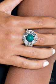 A refreshing green bead is pressed into the center of a shimmery floral frame radiating with swirling detail. Features a stretchy band for a flexible fit.