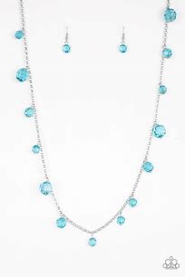 Varying in size, a collection of glassy blue crystal-like beads trickle down a shimmery silver chain across the chest for a whimsical look. Features an adjustable clasp closure.