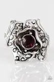 Featuring airy cut-out textures, antiqued silver petals gather around a glowing purple rhinestone center for a whimsical look. Features a stretchy band for a flexible fit.