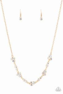 Encased in sleek gold frames, dainty pairs and trios of glittery white rhinestones delicately link into a timeless display below the collar. Features an adjustable clasp closure.