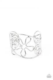 Shiny silver wire bends and curls into groovy floral and swirl frames, coalescing into a psychedelic cuff around the wrist.