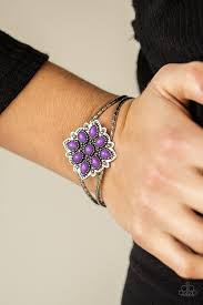 Purple teardrop beads embellish a decoratively studded frame atop a textured silver cuff, creating a whimsical pop of color atop the wrist.