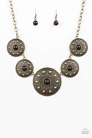 Gradually increasing in size near the center, round silver frames radiating with sunburst patterns link below the collar. Infused with shiny silver studs, the tribal inspired frames are dotted with refreshing black beaded centers for a colorful finish. Features an adjustable clasp closure.
