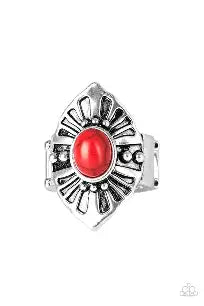A fiery red stone bead is pressed into the center of an angular silver frame radiating with studded and antiqued textures. Features a stretchy band for a flexible fit.