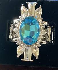 An icy collection of round, marquise, and emerald style white rhinestones radiate out from a blue gem center, creating a glamorous centerpiece atop the finger. Features a stretchy band for a flexible fit.