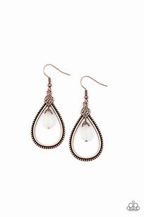 Featuring wire wrap detail, a dainty white stone swings from the top of a studded copper teardrop frame featuring filigree detail for a tranquil finish. Earring attaches to a standard fishhook fitting.