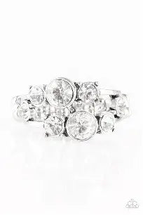 Rows of glittery white rhinestones connect across the finger, coalescing into a glamorous band. Features a dainty stretchy band for a flexible fit.