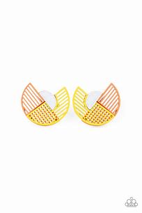 Featuring airy stenciled linear patterns, overlapping yellow and orange crescent shaped frames gather around a dainty white crescent frame, creating a modern display. Earring attaches to a standard post fitting.
