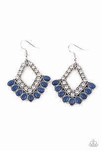 A stationary fringe of oval blue cat's eye stones flare out from the bottom of a white rhinestone encrusted kite-shaped silver frame, creating a colorfully refined display. Earring attaches to a standard fishhook fitting.