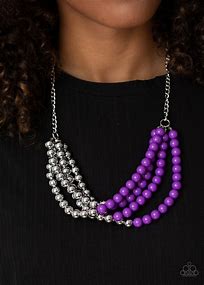 Featuring half silver and half purple beads, a colorful collision of beads layer below the collar for a powerful pop of color. Features an adjustable clasp closure.