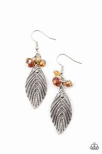 A lifelike silver leaf swings from a cluster of glittery brown crystal-like beads, creating a spring inspired lure. Earring attaches to a standard fishhook fitting.