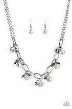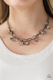 Featuring a metallic shimmer, faceted black gunmetal beads swing from the bottom of bold black gunmetal links. Clusters of faceted black gunmetal beads join the metallic gems, creating a dramatic fringe below the collar. Features an adjustable clasp closure. Sold as one individual necklace. Includes one pair of matching earrings.