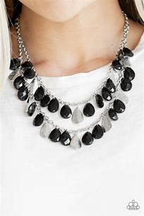 Two strands of silver chain are decorated in a flirtatious fringe of faceted black teardrops. Glittery beveled silver teardrops are sprinkled between the black beading, adding hints of shimmer to the vibrant design. Features an adjustable clasp closure.