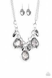 Brushed in a metallic shimmer, oversized glassy beads and faceted silver beads dangle from the bottom of an oversized silver chain below the collar for a dramatic fringe. Features an adjustable clasp closure.