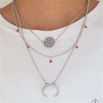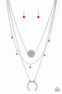 A silver floral frame swings from the uppermost chain, above a strand of faceted pink beads swinging from a shimmery silver chain. A silver crescent frame swings from the lowermost chain, creating whimsical layers down the chest. Features an adjustable clasp closure.