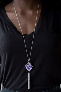 Shimmery silver filigree swirls across a shiny purple backdrop, coalescing into a colorful pendant. A glistening silver chain tassel swings from the bottom of the pendant for a whimsical finish. Features an adjustable clasp closure.