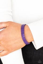 Metal rectangles painted in the spring Pantone® of Amethyst Orchid are threaded along stretchy bands, forming a gorgeous pop of color that wraps around the wrist.