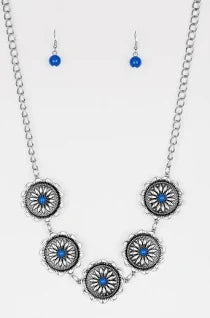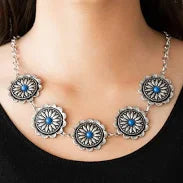 Infused with bright blue beaded centers, ornate floral stamped frames link below the collar for a colorfully, seasonal look. Features an adjustable clasp closure. Sold as one individual necklace.