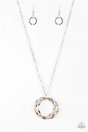 Twirling rose gold, gold, and silver hoops swing from the bottom of an elegantly elongated silver chain, creating a dizzying pendant. Features an adjustable clasp closure.